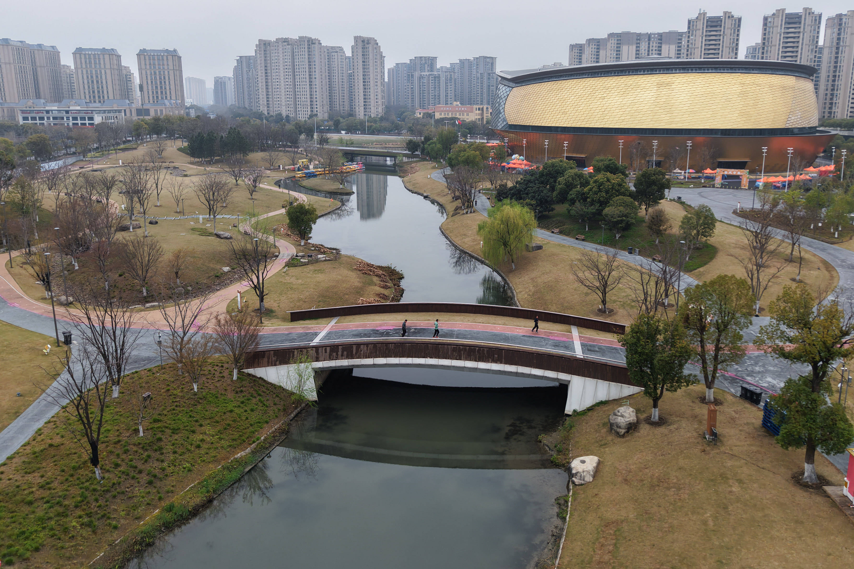 3月21日,市民正在(zai)杭州拱墅(shu)运河体育公园晨跑(无人机照片)。 新华(hua)社(she)记者 黄(huang)宗治 摄